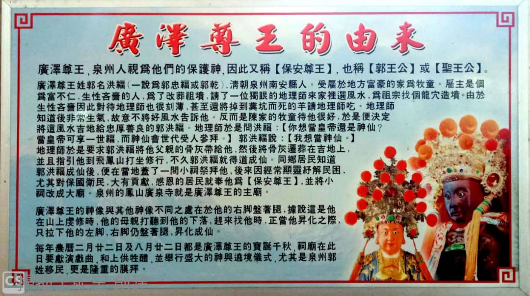 廣澤箄王,泉州人靦他們的保護种,因此又稱【保安王】,也稱【郭王公】或【聖王公魔澤王姓郭名洪(一說儒郭忠福或郭乾),淸朝泉州南安縣人。受雇於地方富豪的家牧童雇主是個富不仁,生性客啬的人,了改葬祖境,請了一位獨眼的地理師來家裡選風水,爲詛宗找個龍穴造境・由於生性客嗇因此對待地理師也很刻薄,甚至還將掉到冀坑而死的羊地理師吃・地理師知道後非常生氣,故意不將好風水告訴他。反而是陳家的牧童待他很好,於是便决定將遺風水吉地給忠厚善良的郭洪福・地理師於是問洪福:【你想當皇带還是陣仙?當皇带可享一世福,而牌仙曹世代受人参拜。】郭洪說:【我想當陣仙。地理師於是要求郭洪福將他父親的骨灰帶給他,然後將骨灰遷葬在吉地上,並且指引他到飛愿山打坐修行,不久郭洪就得道成仙·同鄕居民知道郭洪幅成仙後,便在當地蓝了一間小祭拜他,後來因經常顯靈舒解民困尤其對保國衛民,大有貢獻,感恩的居民就奉他【保安王】,並將小同改成大廟·泉州的原山魔泉寺就是廣澤王的主廟 廣瀑鯨王的像具其他像不同之慮在於他的右脚盤著腿,據說選是他在山上虔修時,他的母親打到他的下落,趕來找他時,正當他昇化之際,只拉下他的左脚,右脚仍盤著腿,昇化成仙 每年是二月甘廿二日及八月甘二日都是魔王的题千秋.朋在此日要獻演放曲,和上供牲,並舉行盛大的脚興追境儀式,尤其是泉州郭姓移民,更是隆重的膜拜